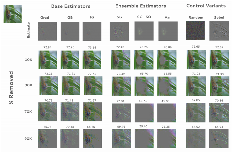 하지만 VarGrad와 SmoothGrad-Squared 방법은 굉장히 설득력있는 중요도 선정 알고리즘이며 임의로 특징점을 지우는 것보다 월등히 좋은 알고리즘임을 보입니다.