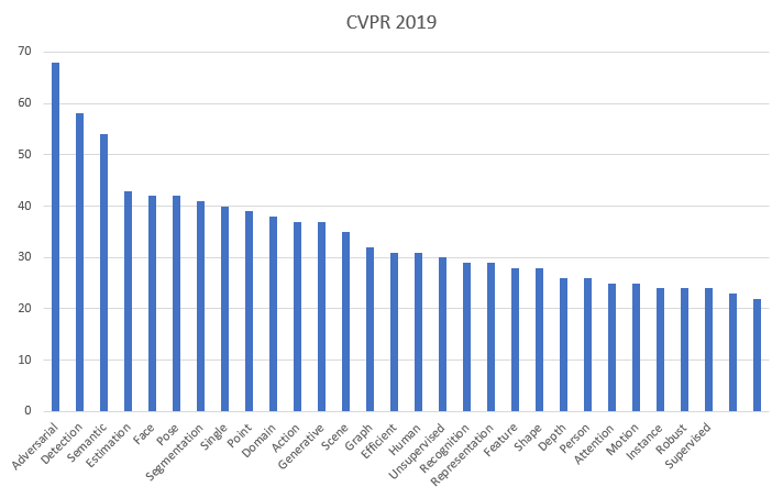 특정 산업과 기술의 트렌드를 파악하기 위한 방법 중 하나로 중요 저널/컨퍼런스에 발표된 논문의 제목들을 이용해 통계를 내는 방법이 있습니다. 이번 글에서는 CVPR 2020에 발표된 논문들을 통해 컴퓨터 비전 연구 관련 트렌드가 어떤지 살펴보도록 하겠습니다.