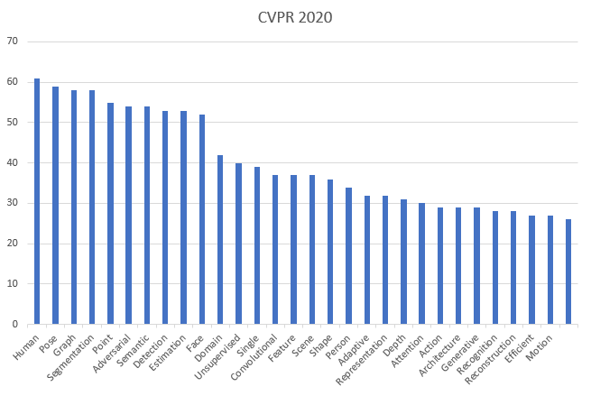 특정 산업과 기술의 트렌드를 파악하기 위한 방법 중 하나로 중요 저널/컨퍼런스에 발표된 논문의 제목들을 이용해 통계를 내는 방법이 있습니다. 이번 글에서는 CVPR 2020에 발표된 논문들을 통해 컴퓨터 비전 연구 관련 트렌드가 어떤지 살펴보도록 하겠습니다.