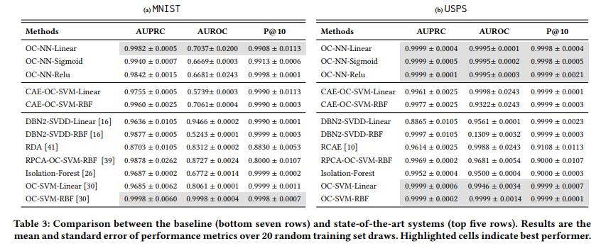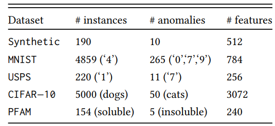 - MNIST, USPS, Cifar10: 이미지 데이터, 이상과 정상 클래스는 위 table1의 데이터셋 표 참고.