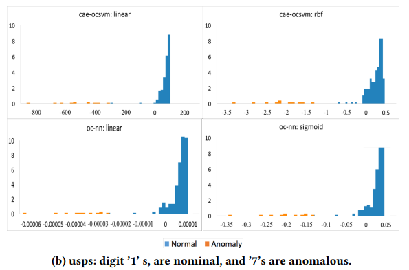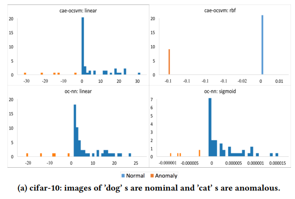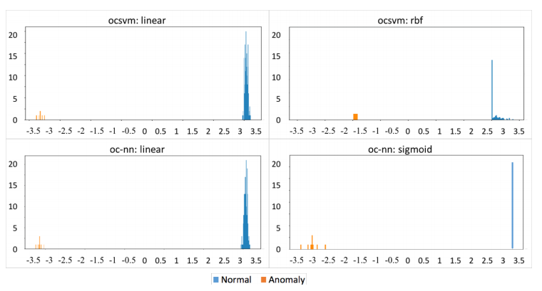 아래 그림에서 보면 이상치의 경우 경계 함수의 값이 음수이며, 기존의 OC-SVM과 유사한 성능을 보인다는 것을 확인할 수 있습니다. 표 4개 중 윗 줄이 OC-SVM결과 이고 아래가 OC-NN의 결과 입니다.