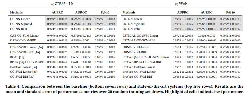 비교된 결과를 통해 확인할 수 있듯이, MNIST와 PFAM 데이터 셋에서 OC-SVM보다 OC-NN의 성능이 더 좋다는 것을 알 수 있습니다. OC-SVM 이외의 다른 방법들과도 비교한 결과는 다음과 같습니다.