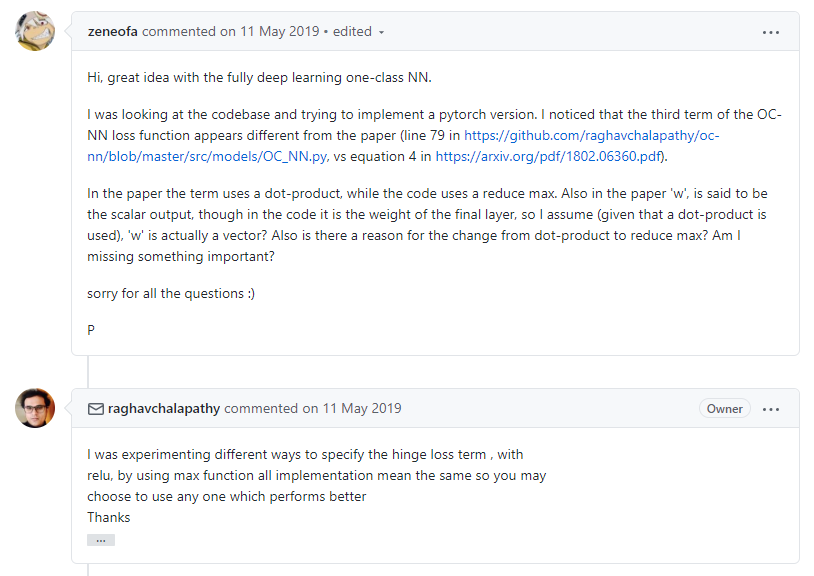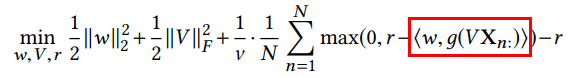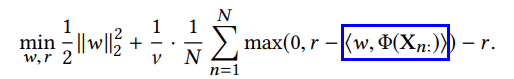 여기서 $ g(V \mathbf{X_{n:}}) $ 는 원본 데이터를 간단한 classifier로 분리하기 위한 feature mapping function으로, $\big< w. g(V \mathbf{X_{n:}}) \big> $를 통해 최종적으로 이상치 여부를 결정하는 거리를 계산합니다. 이 부분이 OC-SVM과의 차이를 나타내는 중요한 부분이라고 논문에서 설명하고 있습니다. OC-SVM은 feature mapping function으로 $\mathbf{\Phi}$ reproducing kernel Hilbert Space(RKHS)를 사용하고 있으며, OC-NN은 이 부분을 Neural Network으로 대체한다는 점이 큰 차이입니다.
