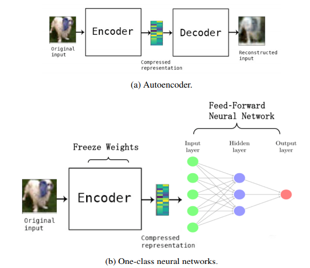 제안하는 모델은 $(\text{a})$ 그림에서 보이는 것과 같이 먼저 입력의 대표적인 특징을 얻기 위해 오토인코더를 학습시킵니다. 이후, $(\text{b})$ 이렇게 학습된 인코더를 이용하여 원본 이미지로부터 특징을 추출한 뒤, 이를 하나의 은닉층을 갖는 Feed-Forward Neural Network에 입력으로 이용하여 이상 탐지를 시도하였습니다.