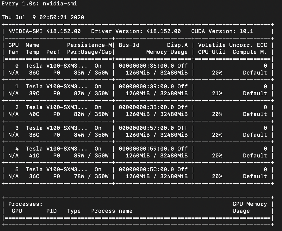 horovodrun을 이용하여 실행하면 다음과 같이 여러 개의 GPU가 함께 사용되는 것을 확인할 수 있습니다.