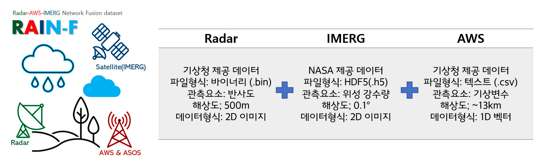 강수량 예측을 위해서 딥러닝 커뮤니티도 여러 연구들을 활발하게 진행하고 있고, 올해 구글에서도 MetNET을 개발하여 미국 해양대기청의 수치 예보 모델보다 더 좋은 성능을 보였다고 발표한 바 있습니다. 이러한 딥러닝 기반의 강수량 예측을 위해서는 강수와 관련된 다양한 자료를 활용하는 것이 중요합니다. 저희는 다양한 강수 관련 관측 자료를 함께 분석할 수 있도록 RAIN-F를 제안하였습니다. RAIN-F를 생산하기 위해 활용한 데이터는 레이더, 지상 관측, 위성(IMERG) 자료입니다.