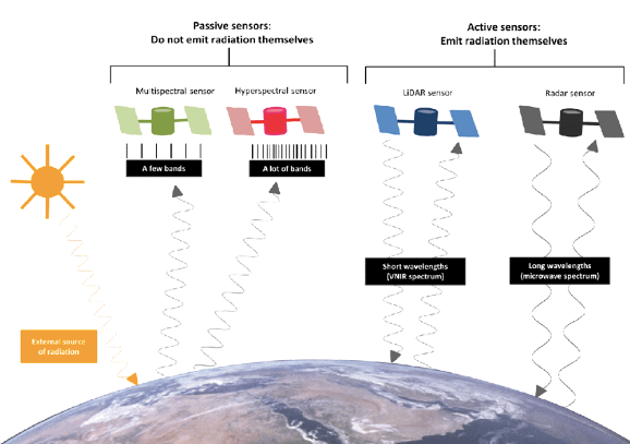 Passive한 위성 영상의 경우 관측 파장대에 따라 Electro-Optical system, Infrared system, Microwave system 등으로 분류할 수 있습니다.