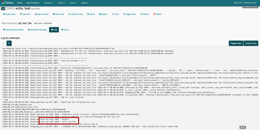 빨간색 박스를 확인해보니 hello airflow가 잘 출력된 것을 확인할 수 있습니다.