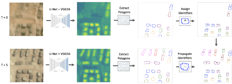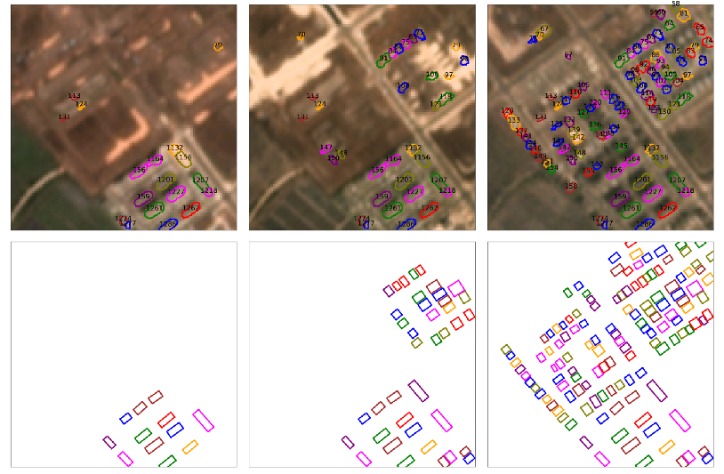 예를 들자면 아래 사진에서 시점 별로 찾아낸 건물의 ID는 다음 시점에서도 해당 건물을 찾고 이전에 검출했던 건물과 동일한 ID를 부여해야 합니다.