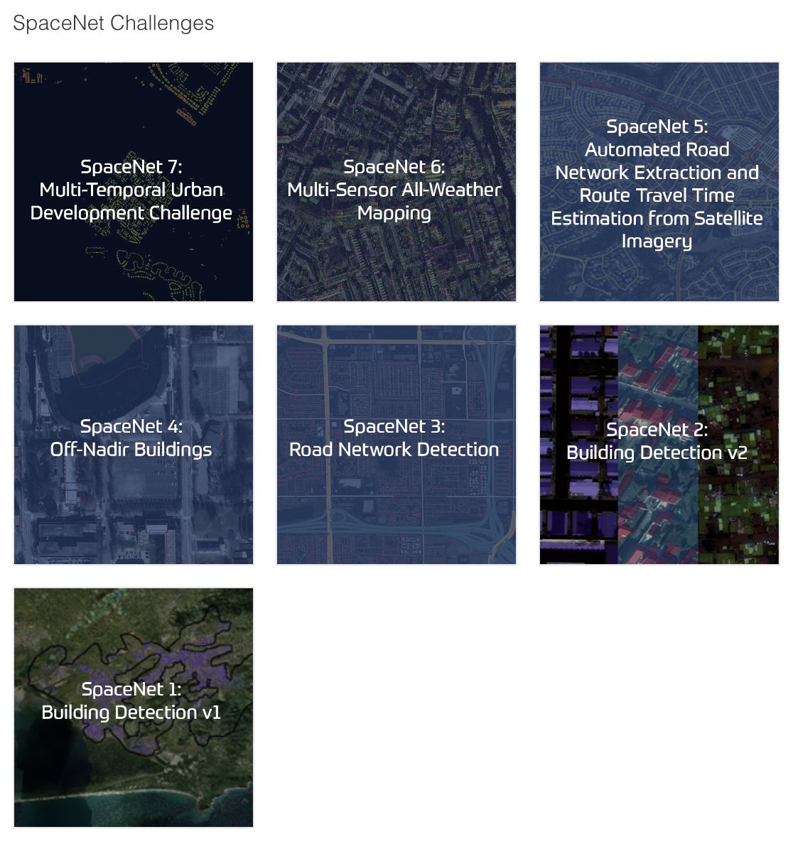 SpaceNet은 지리 정보와 관련된 AI 응용 연구를 하는 비영리 기관입니다. 특히 값비싼 위성영상 데이터, 어노테이션과 관련해 다양한 오픈소스 데이터셋 공개 및 경진대회 개최를 하고 있어 위성영상을 활용하고 싶은 연구자, 개발자들에게 많은 각광을 받고 있습니다.