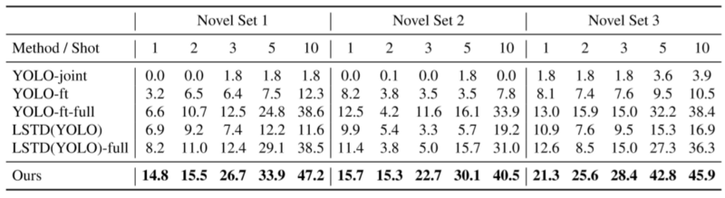 해당 논문은 Pascal VOC에서 5개의 Novel Class Set을 정해 평가하고, 위에서 제안된 LSTD를 YOLO로 구현하여 비교한 결과 더 나은 성능을 얻었다고 말합니다.