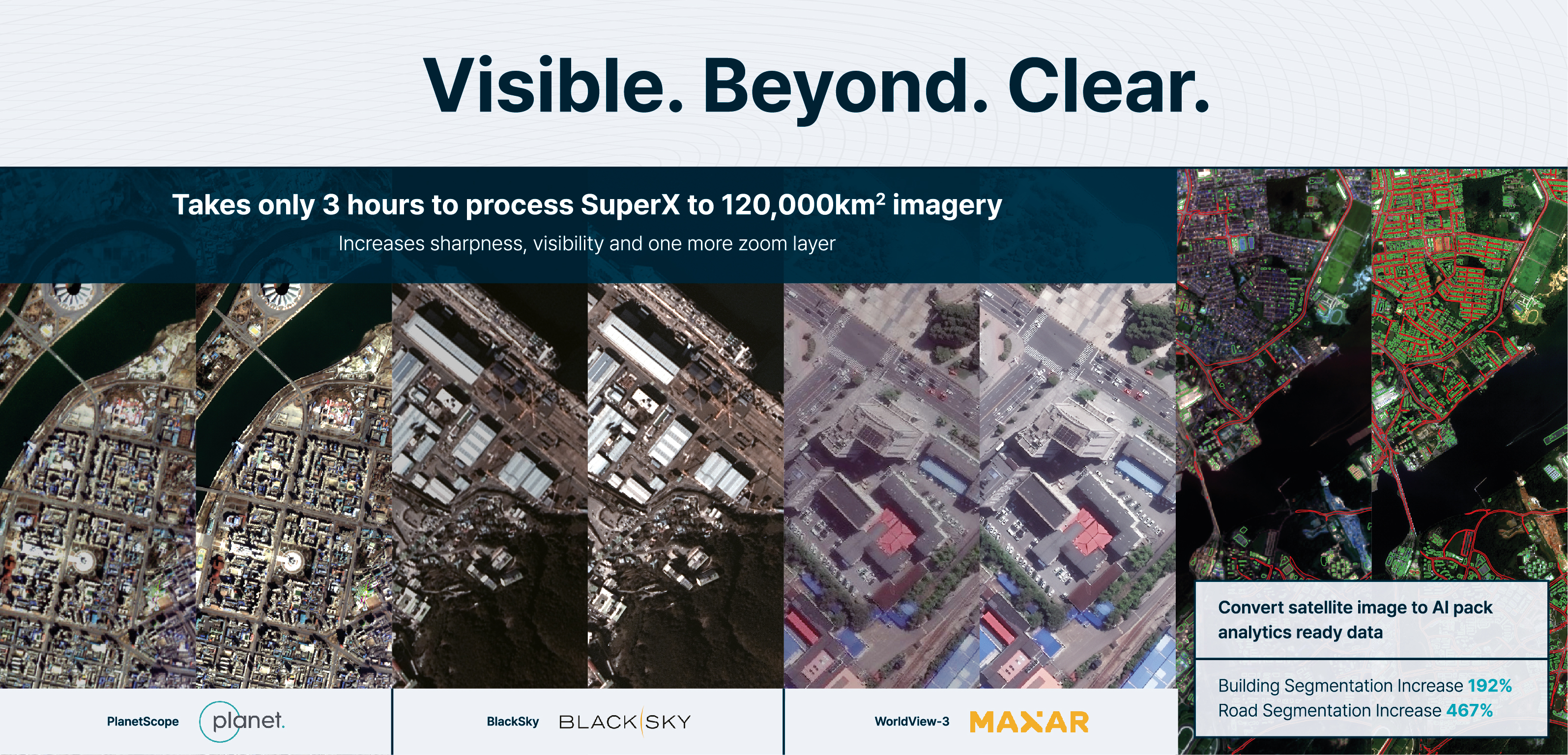 에스아이에이는 미국 민간위성 기업 플래닛, 막사 등과 전략적 솔루션 파트너십 체결을 진행하며 민간위성역량을 끌어 올릴 수 있는 가치를 입증했다. 생성형 AI 기반 위성영상 품질을 높일 수 있는 기술 개발인 SuperX 서비스화에 성공하여 위성영상 데이터의 해상도와 분석 가치를 끌어올리는데 기여했다. 해상도가 낮지만 넓은 영역을 촬영할 수 있는 데이터를 더욱 가치 있게 사용할 수 있게 하고, 이를 통해 저해상도 영상 또한 AI 분석에 활용할 수 있는 새로운 판로를 모색했다. 해상도는 AI 인식률을 결정하는 주요한 요소로 낮은 해상도의 위성 영상을 분석 가능한 데이터로 탈바꿈시켜 지구 관측에서 얻는 정보를 선제적으로 확인할 수 있는 환경을 만드는 데 기여하고 있다.