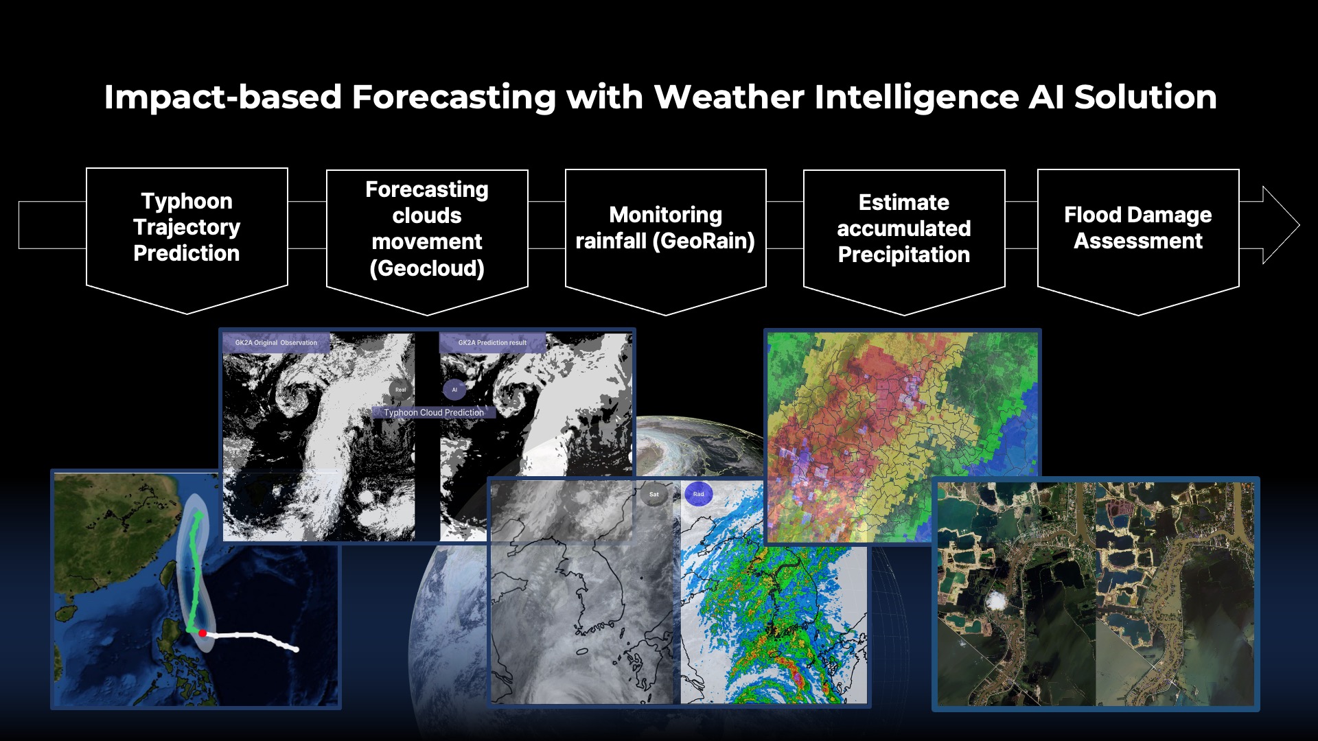 에스아이에이는 기후 위기에 대응하기 위한 ‘영향 기반 예측 기상 기후 AI 솔루션’의 구체적인 방향을(Impact-based forecasting with Weather Intelligence AI Solution) 소개했다. 기상 위성 데이터를 기반으로 구름의 이동을 예측하는 ‘GeoCloud’ 솔루션과, 강수에 대한 정확한 모니터링을 제공하는 ‘GeoRain’ 솔루션을 통해 태풍 경로 예측에 대한 기초 정보를 제공할 로드맵을 구체적으로 설명하며 어느 정도의 강수량이 얼마만큼 지속될 지 등 홍수에 영향을 주는 피해 측정까지 예측, 모니터링, 복구의 통합 솔루션을 제시했다.