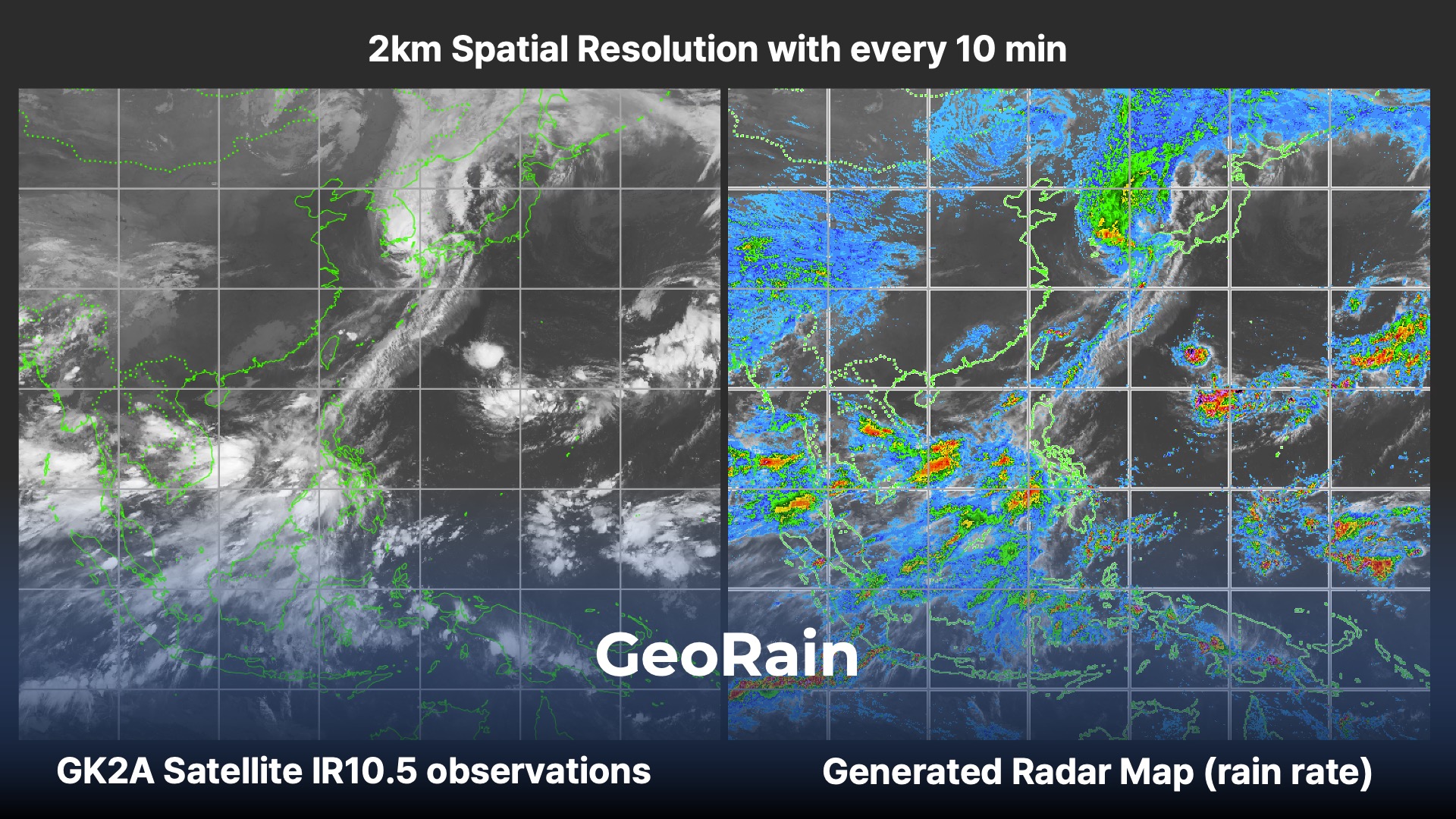 In essence, by utilizing GeoCloud and GeoRain together, it will be possible to comprehensively understand approaching typhoons from the sea, predict their path, and observe how precipitation is developing along the path. This service will be integrated into the 'OVISION earth' platform in the first half of next year, providing an amazing amount of meteorological and climate information.